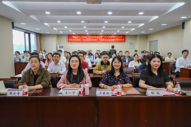 为深入学习贯彻习近平新时代中国特色社会主义思想,全面贯彻落实党的二十大和二十届二中全会精神,促进党建与业务互融互促,生动讲述在党的二十大精神指引下广大学生奋进新时代的信心决心,2024年5月31日下午,生工食品学院在农生环D416举办2024年“牢记嘱托担使命,感恩奋进启新程”微党课大赛决赛暨“生食先锋”宣讲团、“清廉生食”宣讲团聘任仪式。学院党委副书记王一清、党委委员卢黄娉、组织员张文馨、团委书记梅玫等担任评委,活动由信息二党支部程宇馨主持。