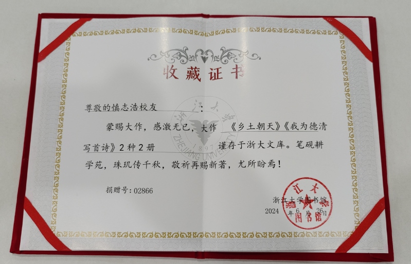 在古籍特藏部韩松涛部长及高艳两位老师的引领下,慎志浩校友及书友们在参观基础馆一楼的浙江大学校史展览后,来到位于基础馆四楼的浙大文库,在此举办了简短、庄重的《乡土朝天》捐书仪式。在书桌前,慎志浩校友怀着激动的心情,在著作内封页题跋签名,并随后将力作《乡土朝天》捐赠给母校浙江大学图书馆-浙大文库。韩松涛部长代表浙江大学图书馆郑重地从慎志浩校友手中接过赠书,并随后向慎志浩校友颁授《浙大文库收藏证书》。与《乡土朝天》一书同时捐赠的还有慎志浩校友主编的、由上海文艺出版社出版的《我为德清写首诗——首届莫干山国际诗歌节作品选》。