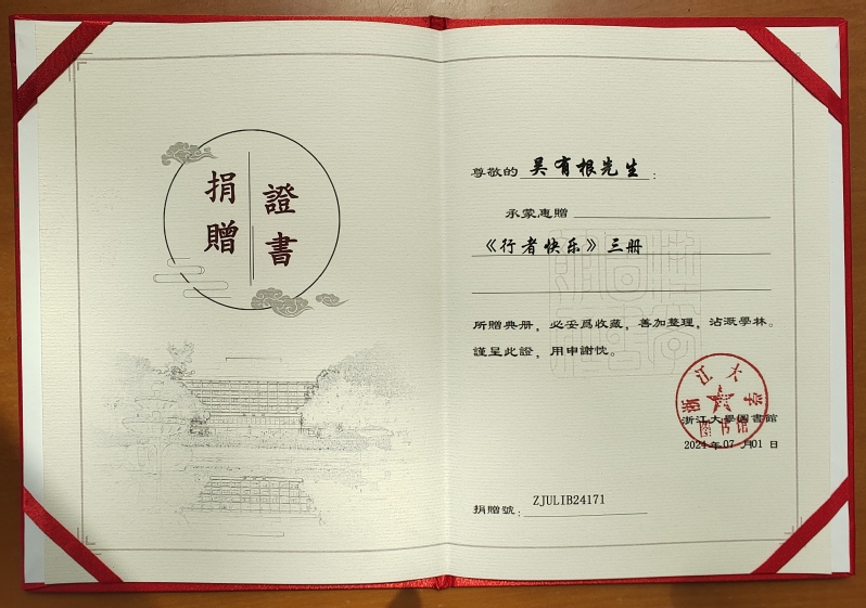 最近bat365正版唯一官网农业机械87届校友吴有根收到浙江大学图书馆及浙大文库向其颁授的《行者快乐》浙江大学图书馆捐赠证书及浙大文库收藏证书。