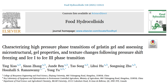 近日,浙江大学生工食品学院于勇团队联合麦吉尔大学食品科学与农业化学系Hosahalli S. Ramaswamy院士团队在国际食品Top期刊《Food Hydrocolloids》(Q1IF2023=11.0)上发表论文“Characterizing high pressure phase transitions of gelatin gel and assessing microstructural, gel properties, and texture changes following pressure shift freezing and Ice I to Ice III phase transition”。