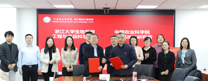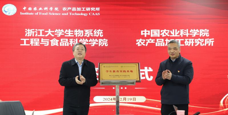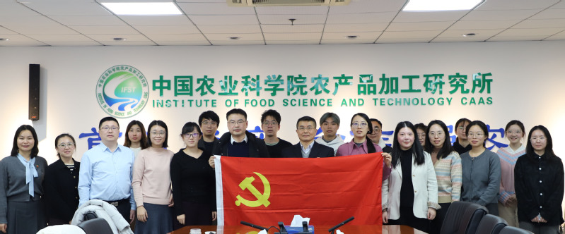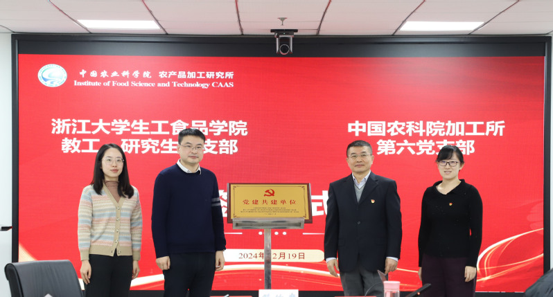 学院食品生物科学技术研究所教工党支部和研究生第一党支部与中国农业科学院农产品加工研究所第六党支部进行结对共建。康威、刘佳萌、陆柏益和赵敏洁代表三方党支部为党建共建单位揭牌。