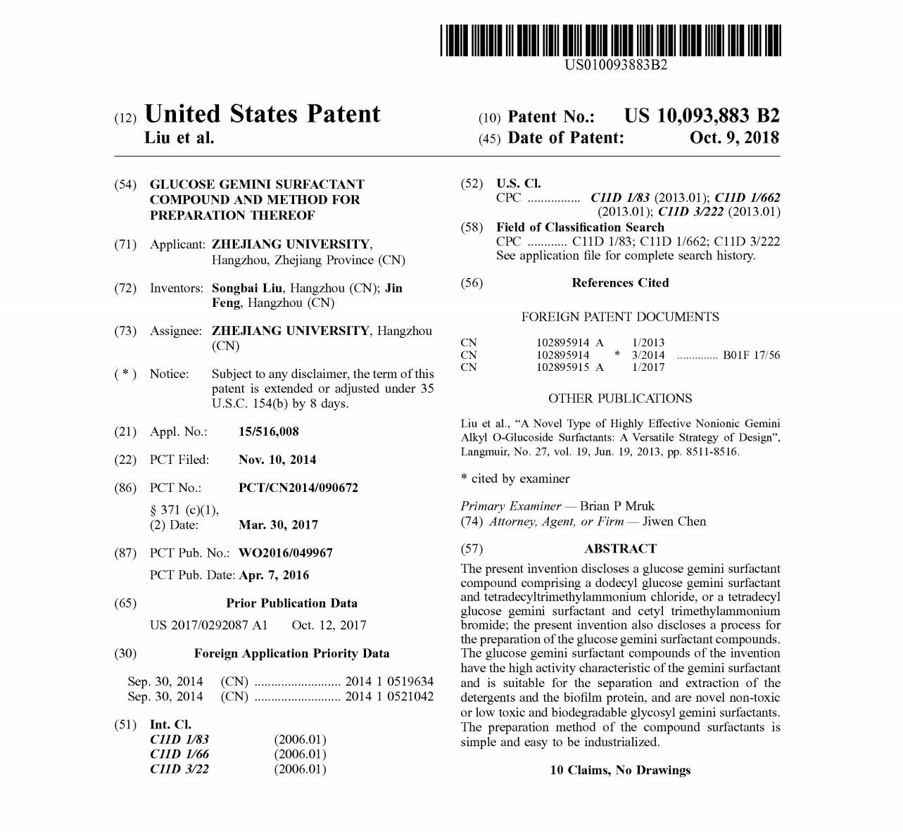 United States Patent No. 10,093,883, issued on Oct. 9, 2018, was assigned to ZHEJIANG UNIVERSITY (Hangzhou, China).