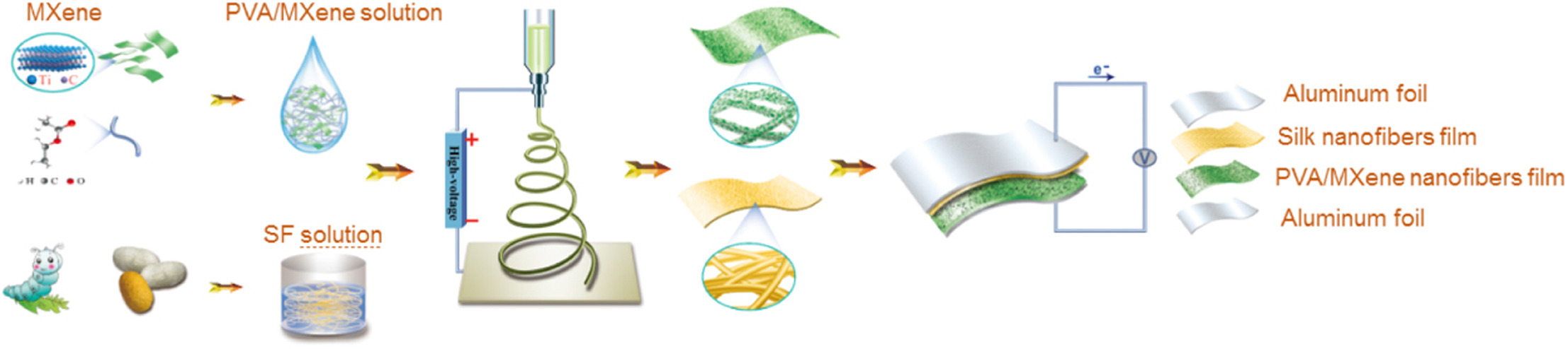 Theincreasing potential of wearable electronics has been motivating thedevelopment of self-powered devices to overcome the restriction imposed byconventional power supply. Herein, a kind of highly electronegative andconducting material of MXene nanosheet has been innovatively integrated withpoly(vinyl alcohol) (PVA) for electrospinning nanofibers film to fabricate flexibleall-electrospun triboelectric nanogenerator (TENG). Silk fibroin (SF) waschosen for electrospinning nanofibers film to serve as electron donor for TENGwith great triboelectricity and biocompatible nature. The MXene-basedall-electrospun nanogenerator shows excellent stability and durability as wellas extraordinary electrical performance, which supports an instantaneouslymaximum peak power density of 1087.6 mW/m2 as the load resistance is 5.0 MΩ.Moreover, beyond harvesting electrical power, the fabricated TENG was utilizedfor real-time monitoring various types of body motion. Lastly, we used thedeveloped TENG to power electrowetting on dielectric (EWOD) chip to actuatedroplet transport. Considering the excellent triboelectric performance, ease oflarge-scale manufacturing, and environmental friendliness, this MXene-basedall-electrospun TENG provides a promising solution for developing practical,flexible, and self-powered electronic devices.