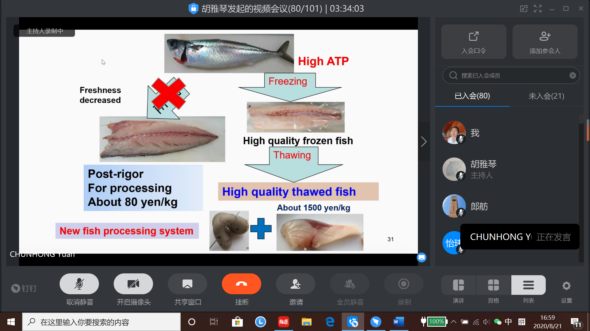 At last, Dr. Chunhong Yuan gave alecture on “Recent Freshness Preservation Technology of Fish and Shellfishfrom Catch to Consumption in Japan”. She mainly introduced “What isfreshness”, “How to keep freshness”, and several case study in Japan on fisheryproducts.